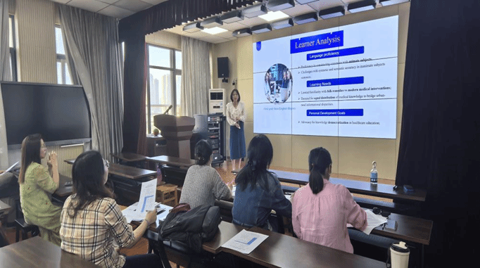经各系(教研室)动员推荐、教师自主报名,王婵团队、刘锐团队、吴娱团队入围本次校级决赛。比赛中,参赛教师围绕所授课程主题,依据公司《课程思政教学竞赛课堂教学设计作品评分标准》,从教学目标、内容设计、实施路径等维度展开说课,重点阐释如何将思政元素(如文化自信、国际视野、跨文化沟通能力等)有机融入外语课程教学,展现了 “知识传授与价值引领相统一” 的教学设计思路。