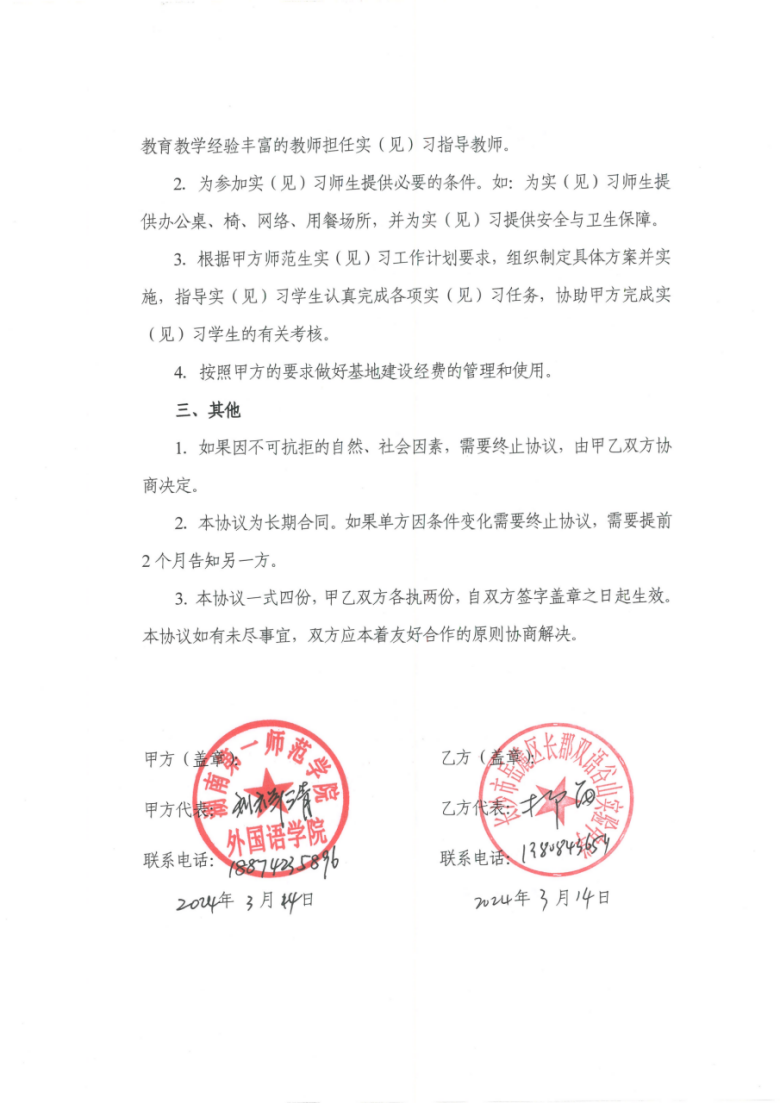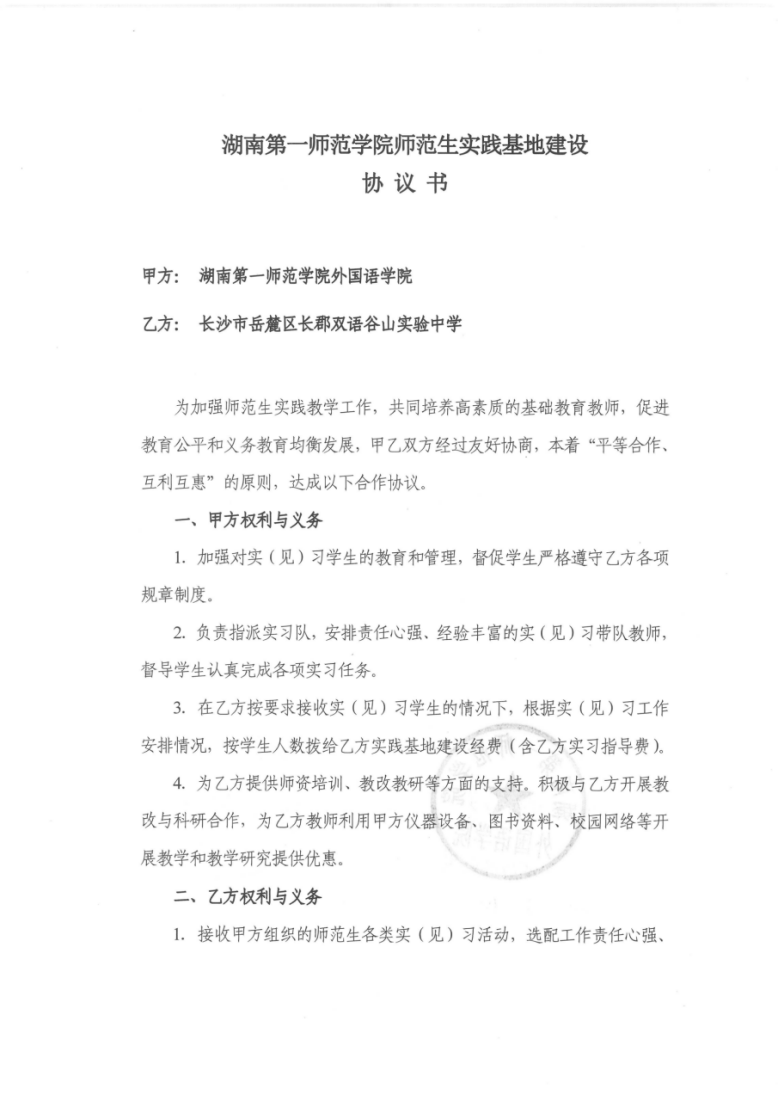 3月29日,公司与长郡双语谷山实验中学签订教育实践基地共建协议。公司教科办主任廖爱秀、英语系主任张昀霓和长郡双语谷山实验中学柳笛董事长就教育实践、实践指导、实践安排等交换了意见。
