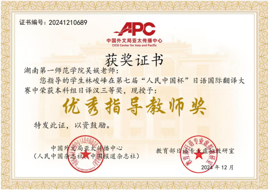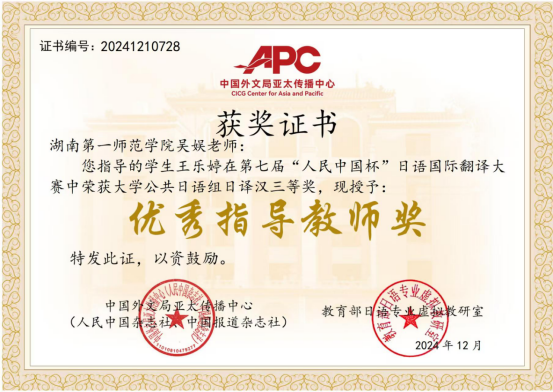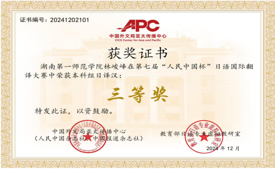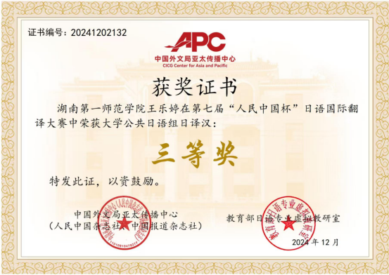 第七届“人民中国杯”国际日语翻译大赛近日落幕,公司文学与新闻传播公司2024级汉语言文学专业1班林峻峰荣获全国大学本科日语组三等奖、伟德国际1946bv官网2022级英语专业4班王乐婷荣获全国大学公共日语组三等奖。伟德国际1946bv官网22级英语4班吴玉依凡、吴媛获得公共日语组日译中优秀奖,杨澜获得公共日语组中译日优秀奖,商公司24级国际经济与贸易2班陈逸仪获得本科日语专业组日译中优秀奖。指导教师吴娱获得优秀指导老师奖。本次比赛吸引了天津外国语大学、四川外国语大学、西安外国语大学、广东外语外贸大学、厦门大学、武汉大学、湖南大学、华中师范大学、首都师范大学等多所高校师生和企事业单位选手参赛。