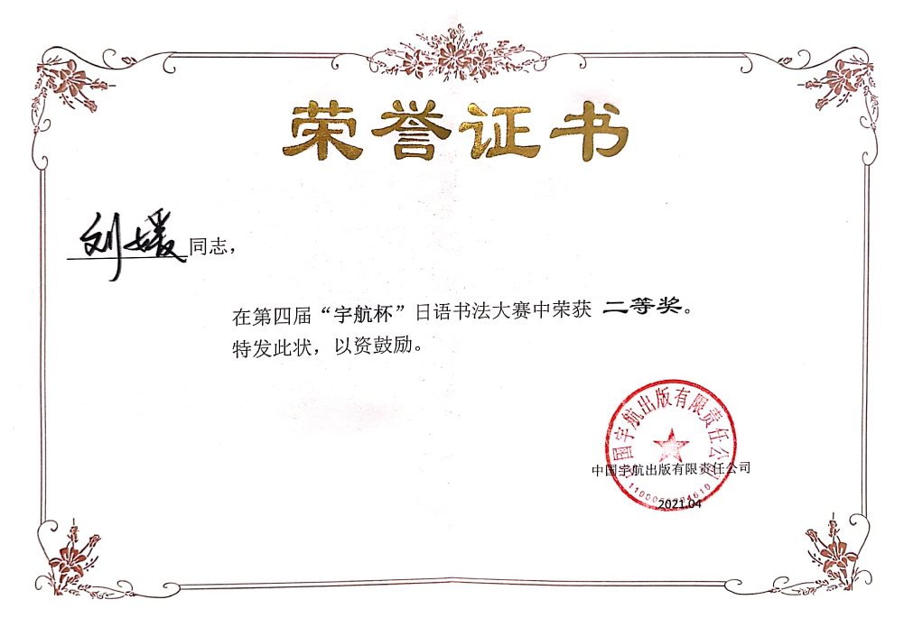 2021年5月,伟德国际1946bv官网18英语5班刘媛参加第四届“宇航杯”日语书法比赛获得全国二等奖的好成绩。吴娱老师获得优秀指导老师奖,伟德国际1946bv官网获得最佳组织奖。