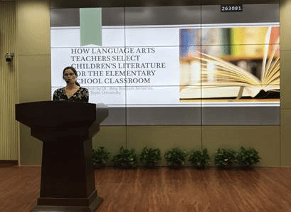 10月22日下午,Amy教授在伟德国际1946bv官网同声传译室做了题为“How Language Arts Teachers Select Children’s Literature for the Elementary School Classroom”(语言艺术教师如何为小学课堂选择儿童文学)的讲座。副经理康响英教授主持,伟德国际1946bv官网一百多名师生参加了讲座。Amy教授介绍了美国小学的教育现状,分析了美国小员工不同阶段的阅读素材。Amy教授重点阐述了小学教师该如何选择合适的儿童文学阅读读物,并在教学中如何进行道德渗透。Amy教授展示了美国最近20年的流行绘本,并以这些儿童文学节选读物为例,指导大家根据作品的内容进行教学,例如教员工做正确的决定、理解家庭的重要性、避免不必要的纷争、明白基督徒的价值观等等。最后Amy教授总结了进行儿童文学教学的意义,即帮助形成正确的价值观、促进儿童的健康成长。
