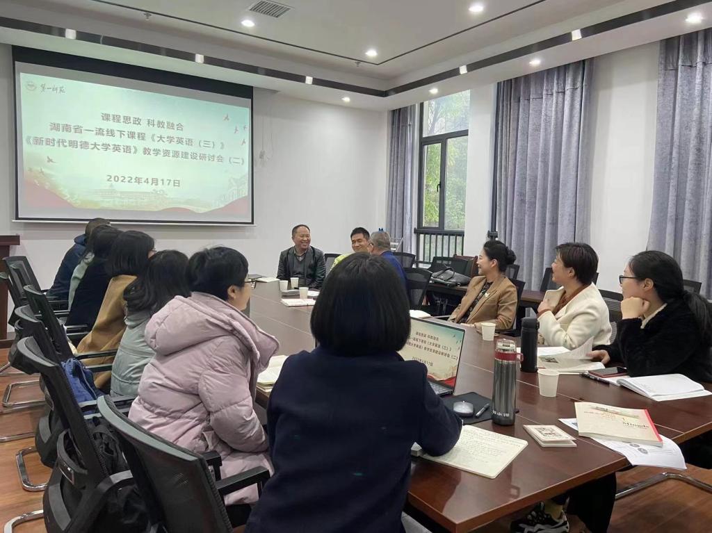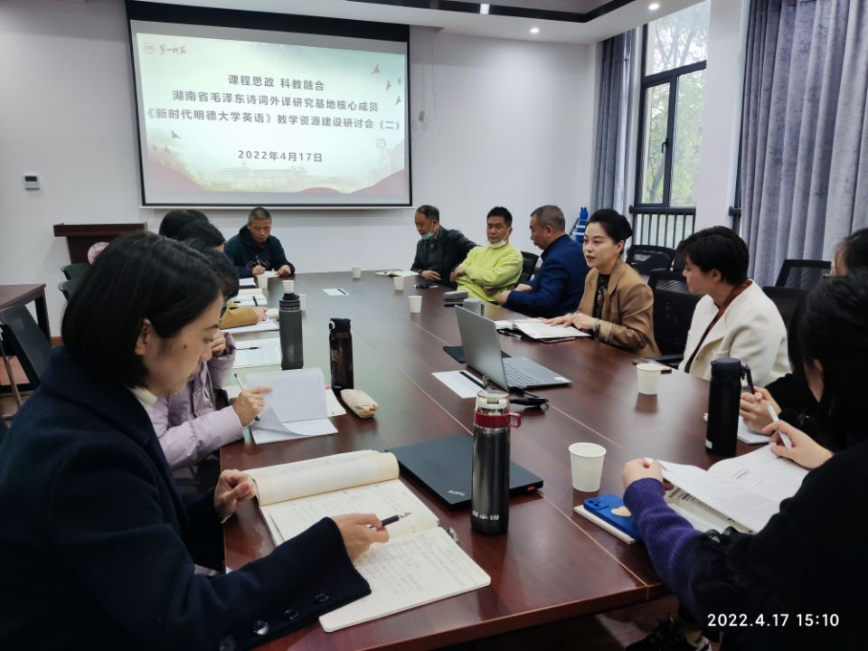 为进一步推进《大学英语》课程思政建设,“湖南省毛泽东诗词外译研究基地”核心成员与湖南省一流线下课程《大学英语(三)》课程组成员于2022年4月17日在伟德国际1946bv官网会议室再次举行了基于课程思政的《新时代明德大学英语》教学资源建设研讨会。会议特别邀请了《新时代明德大学英语》主编湖南大学伟德国际1946bv官网刘正光教授、何岚教授前来指导。整个会议由伟德国际1946bv官网陈圣白副经理(主持工作)主持,参加会议的有伟德国际1946bv官网刘祥清书记、刘宇松副经理以及陈喜贝、龙君、梁薇、雷琬瑢、唐新萍、谭建慧、陈迎、蒋丽梅等老师,高等教育出版社湖南省教学服务中心李云峰副主任莅临会议。