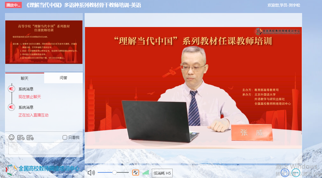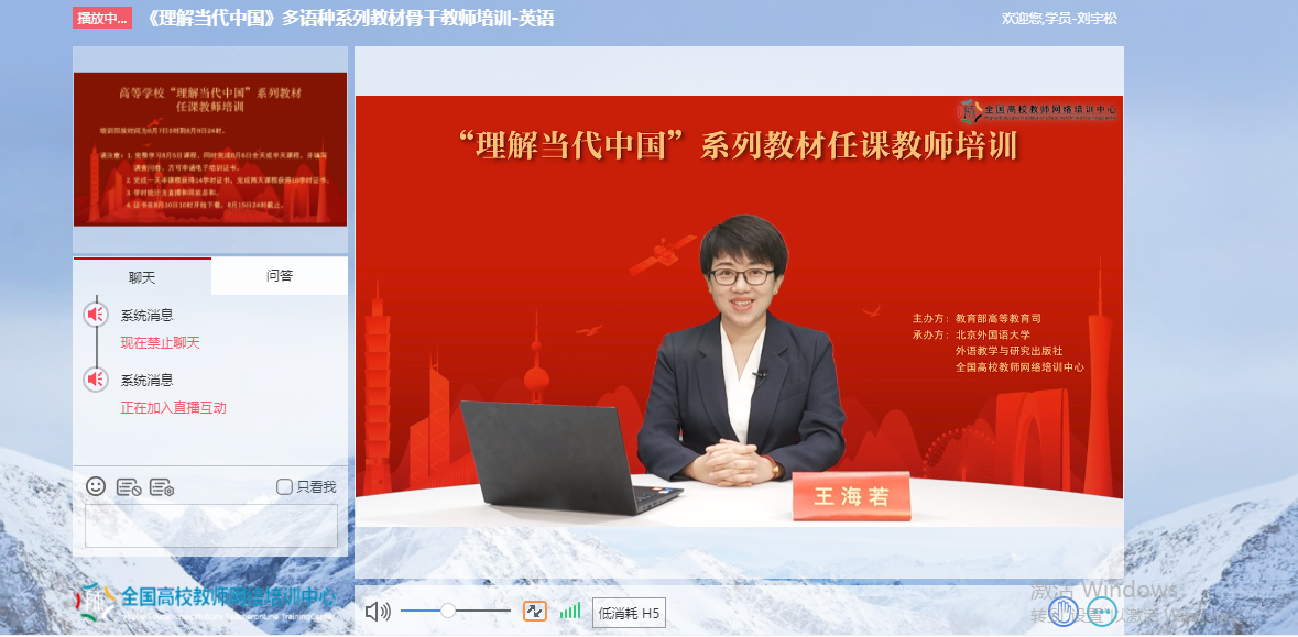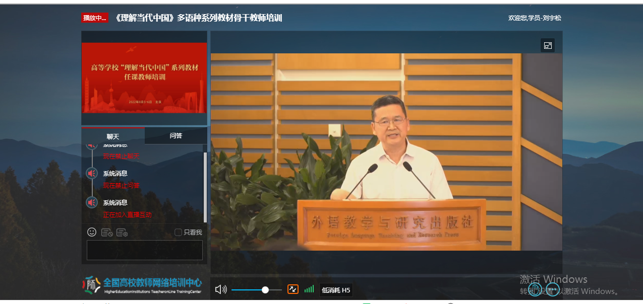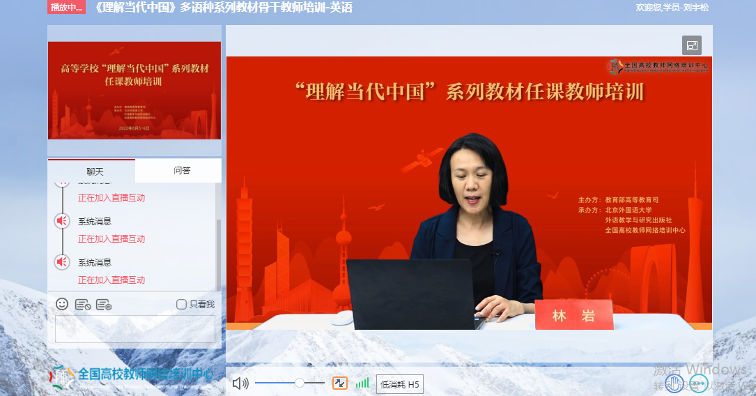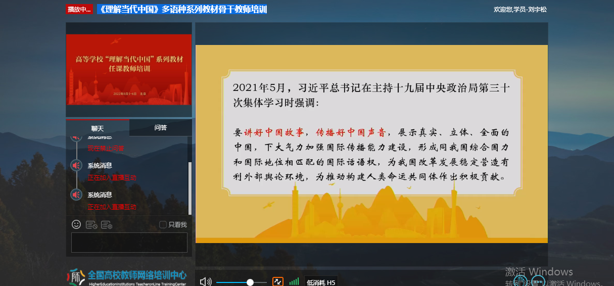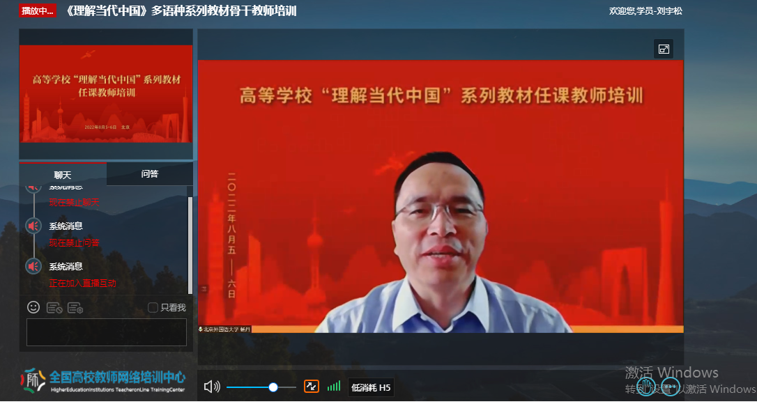 为深入贯彻《习近平谈治国理政》多语种版本进高校进教材进课堂(以下简称“三进”)工作精神,2022年8月5日至6日,公司全体院领导、专业负责人、系(教研室)主任、读写组、翻译课程组、二外课程组、综合英语课程组课程负责人及成员20余人参加了由教育部高等教育司组织、北京外国语大学、外语教学与研究出版社、全国高校教师网络培训中心共同承办的“理解当代中国”多语种系列教材任课教师线上培训。