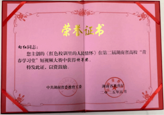 5月20日,第二届湖南省高校“青春学习堂”短视频大赛颁奖典礼在中南林业科技大学举行,公司副教授向红博士凭借作品《红色校训里的人民情怀》荣获教师组特等奖。