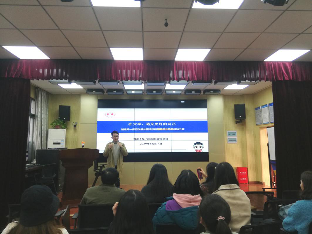 目前攻读湖南大学汉语国际教育硕士的2015级外院学子陈雄以“在大学,遇见更好的自己”为主题,分享了自己在本科期间丰富的课外活动和开展员工工作的经验,鼓励大家提高自己的视野,不断认识自我、完善自我,并在这个过程中成就自我。除此之外,他还向大家讲述了如何备战考研,提醒同学们做好清晰的规划,有计划地复习,提高学习效率。