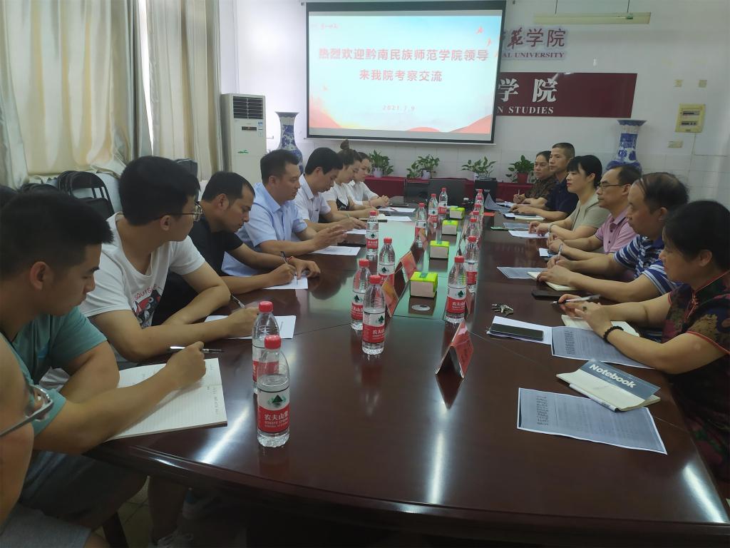7月9下午,黔南民族师范公司教务处处长陈钧一行7人来院考察交流。交流会由李亚林书记主持,教务处副处长唐文杰、公共外语教学部主任刘明东、公司党政领导及教科办同志参加了交流会。