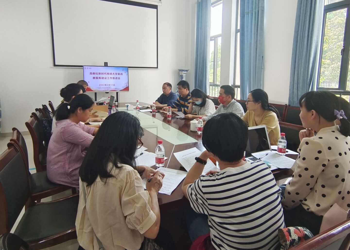 为推进公司湖南省一流课程《大学英语》课程思政建设,“湖南省毛泽东诗词外译研究基地”核心成员2022年4月11日在伟德国际1946bv官网会议室举行了基于课程思政的《新时代明德大学英语》教学资源建设研讨会。会议由伟德国际1946bv官网刘宇松副经理主持,伟德国际1946bv官网刘祥清书记、陈圣白副经理(主持工作)、康响英副经理、“湖南省毛泽东诗词外译研究基地”首席专家刘明东教授以及核心成员参加研讨。高等教育出版社湖南省教学服务中心李云峰副主任莅临研讨会。