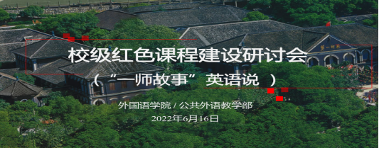 为适应新时代教育要求,落实“立德树人”根本任务,推动校级红色课程建设,伟德国际1946bv官网/公共外语教学部“‘一师故事’英语说”教学团队于2022年6月16日在百熙楼223室进行了红色课程建设专题研讨。研讨活动邀请教务处副处长唐文杰和外院教学副经理刘宇松莅临指导,“‘一师故事’英语说”教学团队全体成员参加。研讨活动由陈喜贝主持。