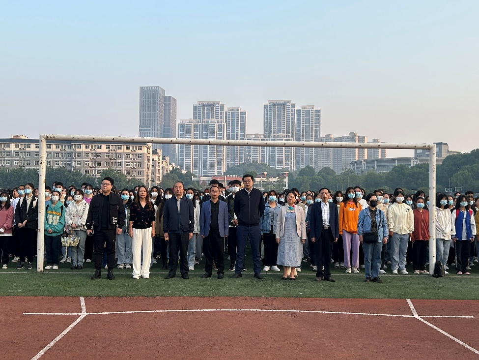 10月17日早上七时,伟德国际1946bv官网在田径场代表公司隆重举行升旗仪式。公司党委书记刘祥清、党委副书记禹晗、副经理唐文杰和康响英 、全体辅导员、党员教师代表胡启海教授以及2022级全体员工参加了此次升旗仪式。此次升旗仪式在中国共产党第二十次全国代表大会胜利召开的第二天举行,因而特殊而又庄重。