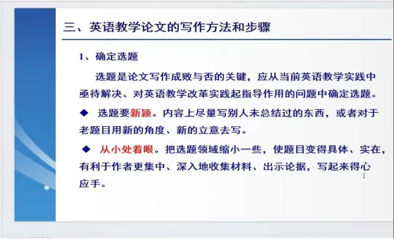 赵纯老师首先分析了大学英语论文的特点,然后指出论文分为形式知识性小论文、经验总结研究性论文和实验报告或调查报告三种。然后他向同学们展示了写论文的方式步骤,并讲解了如何更好运用各种方法写得更好。接着他展示了英语论文撰写策略,包括如何确定选题,构思谋篇,执笔行文等,重点探讨了现代社会对于英语论文的思考。