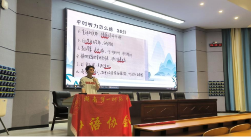 分享会上,两位主讲人围绕大学英语四级的各个专题展开了深入讲解,详细介绍了写作技巧、听力攻略、阅读方法,翻译技巧和口试策略等相关题型高效的解题方法和提升学习效率的建议。曹昊同学首先为大家梳理了英语四级的整体考试流程,并提出了“四大原则”——预读原则、顺序原则、概率原则及排除原则,强调在备考过程中需养成良好做题习惯,并注重知识的灵活运用。何文洁同学则重点分享了听力部分的攻略,特别提到了“利用题干阅读时间预读选项”的策略,深入讲解了“关键词记忆法”在听力练习中的重要性。同时,她还针对阅读和翻译部分提供了词汇积累、信息筛选能力的培养等宝贵建议。除了专业知识的分享,两位主讲人还为大家提供了考场应试技巧,如通过“深呼吸法”缓解紧张情绪,“积极心理暗示法”提升自信,以及“合理分配时间法”来优化答题节奏。