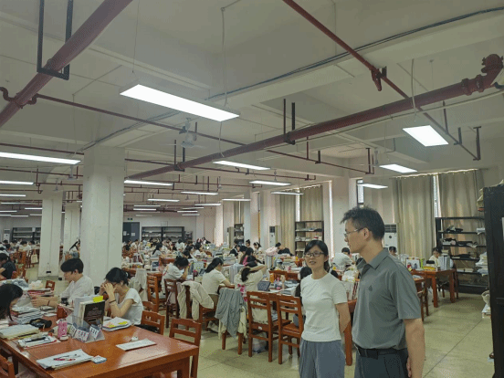 7月7日上午,公司党委副书记戴建宇、副经理王佳娣及辅导员一行深入图书馆102自习室,检查公司考研员工自习情况,并开展备考督导工作。