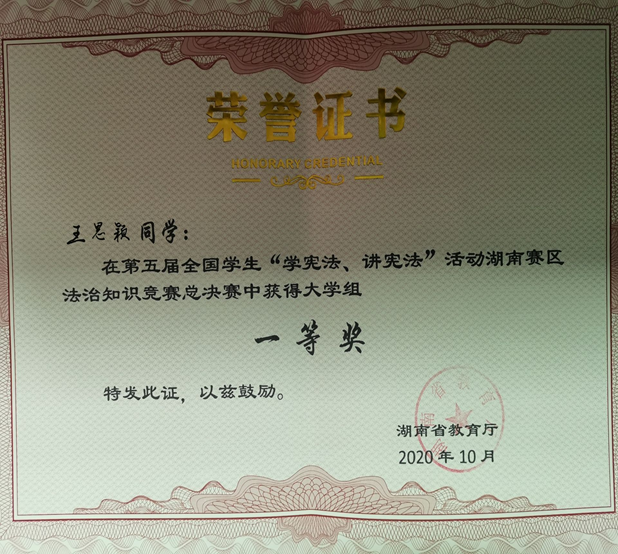 此次“学宪法讲宪法”活动比赛共有初赛和决赛两个环节。公司王思颖同学在马克思主义公司肖霄老师的指导下认真学习宪法知识,完成好每一道学习题库中的题目,经过半个月的反复练习和老师的要点指导,王思颖同学最终获得第五届全国员工“学宪法讲宪法”活动湖南赛区法制知识竞赛总决赛大学组一等奖的好成绩。