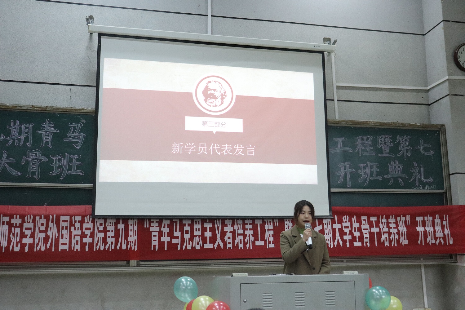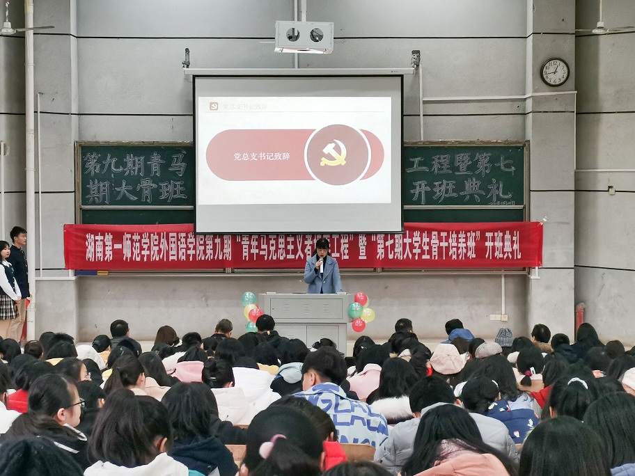 2020年11月24号,bevictor1946韦德官网在怀中南110教室举行了以“青春勇担当,服务新时代”为主题的第九期“青年马克思主义培养工程”暨“第七期老员工骨干培养班”开班典礼。活动旨在加强公司员工干部队伍建设,提高公司员工干部的理论水平、战略思维、领导能力和党性修养;同时在员工群体的思想引领工作与文化教育工作上,培养他们树立自己的人生理想,面对阻碍迎难而上,勇于担当的精神品质。参加此次培训人员共175人,党总支书记李亚林、党总支副书记杨虎智、团总支书记张明、学工办主任陈阳老师以及全体辅导员受邀出席典礼。
