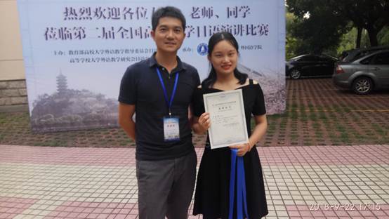 时值金风送爽的中秋佳节,公司刘锐老师指导的15级688班郑紫君同学为公司献上了一份礼物!9月22日,由教育部高校大学外语教学指导委员会暨高等公司大学外语教学研究会日语分会主办的“第二届全国高校大学日语演讲比赛”在江苏科技大学举行。来自全国33所高校的选手参加了此次比赛。经过激烈角逐,公司郑紫君同学荣获二等奖,为公司争得了荣誉。