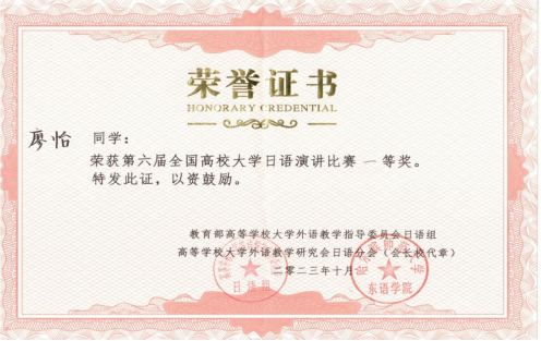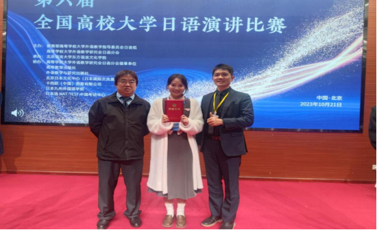 10月21日,由教育部高等大学外语教学指导委员会日语组和高等公司大学外国语研究会日语分会联合主办的第六届全国高校大学日语演讲比赛,在北京语言大学落下帷幕。公司初等教育公司22级小教文2班廖怡同学荣获全国一等奖,指导老师刘锐、范晓露获得优秀指导老师奖。