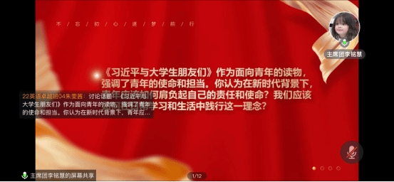 与会全体同学通过围绕《习近平与老员工朋友们》展开热烈讨论,积极探讨在新时代背景下,青年应如何肩负起自己的责任和使命,并在日常学习和生活中践行这一理念,将读书会的氛围推向高潮。大家踊跃发言,纷纷表示要志存高远、脚踏实地,努力学习并践行思想,为国家和民族的发展贡献青春力量。