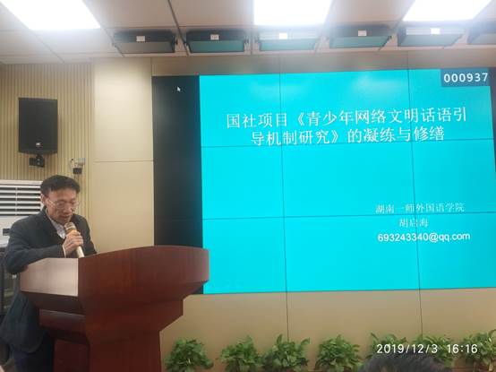 2019年12月3日下午,伟德国际1946bv官网举行“乐之论坛”活动,胡启海教授在怀中北605教室为全院师生做了一场题为“国社项目《青少年网络文明话语引导机制研究》的凝练与修缮”讲座。参加人员为伟德国际1946bv官网院领导、部分教师和员工代表。