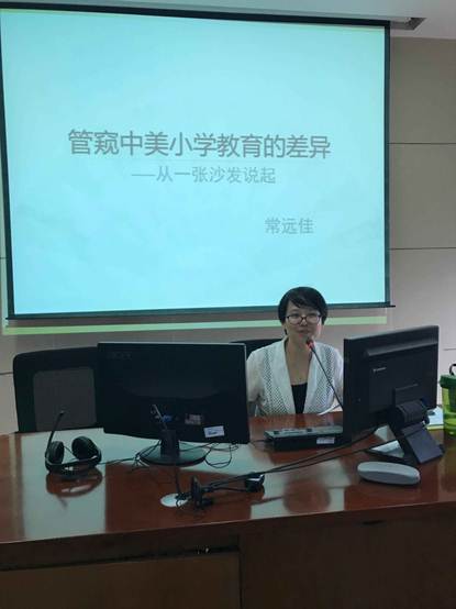 第二场讲座是常远佳博士的以“美国小学教育观察与思考”为主题的讲座。常博士说美国的教育让她印象深刻的有四点:一是平实有力、有可操作性的办学目标;二是教育理念,为什么学,如何学与学什么同等重要;三是员工观,公司认为,师生之间亲密合作的关系是员工高质量学习的基础;四是教学方法,公司建构了一套自身的教学方法,即“质疑、反思、行动”,以提高员工的批判思考、整合知识、应用所学的能力。美国的这些教育理念引发大家对国内的小学教育进行反思,我们应该吸收他人的长处,努力完善自己。