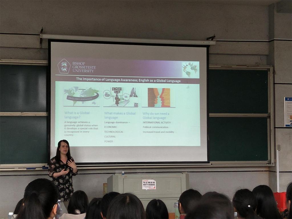 TESOL课程领袖Ami深入介绍了“对外英语教学”的教学理念和具体内容,并进行了典型案例的分析。讲座分为五个部分:第一部分从自身角度出发讲述格罗斯泰斯特主教大学的教师发展前景和对英语教学的看法,阐述了将英语当做一门外语来学习和将英语当做第二语言来学习的不同之处;第二部分呼吁提高英语是全球化语言的意识,以三个“为什么”的提问阐释“语言全球化”的概念、产生的原因及发展;第三部分强调语言意识的重要性;第四部分具体介绍了对外英语教学栏目的课程安排及办学优势;第五部分是提问环节。师生就自己感兴趣的问题与Ami博士进行了进一步探讨。最后,康响英教授进行了恰如其分的总结。