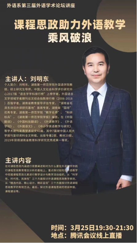 2022年3月25日晚,公司“湖南省毛泽东诗词外译研究基地”首席专家刘明东应邀为山西省长治公司外语系教师进行了题为“课程思政助力外语教学乘风破浪”的学术讲座。