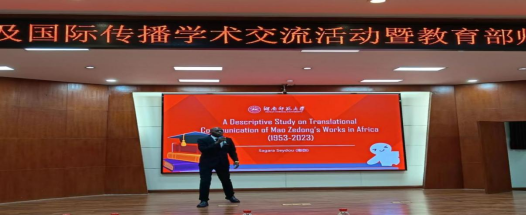 活动论文交流中,湖南师范大学在读博士、来自马里的撒伽分享了“毛泽东作品在非洲的翻译与传播研究”,公司教师代正利、张梦雪、陈喜贝、曾清、吴娱等分别宣读了论文“诗词英译的诗情传达”“从毛泽东诗词英译本看许渊冲的翻译诗学观”“翻译副文本视角下毛诗英译海外传播创新”“毛泽东诗词英译本风格研究”“翻译副文本下竹内实版毛泽东诗词日译研究”,公司蒋理同学以“毛泽东诗词英译研究可视化分析”为题参与了交流。