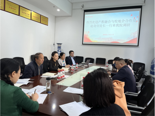 赵处长在随后讲话中对公司重视产学研合作和横向课题申报等表示欣赏,对公司各项工作取得的阶段性成果给予了肯定。赵处长着重强调公司要拓宽工作思路,通过产教融合、科研创新、共建就业实习基地等方式进一步深化校企合作,加强与企业的深度融合,继续做大做强校企合作项目;要思考如何将科研成果转化为企业生产力;要尽早安排员工去企业参观、学习、实习,引导员工合理规划职业生涯,通过横向课题培养员工的实践能力;还要邀请企业工程师、高层次人才参与课堂教学、专业课程设置和人才培养等,充分发挥产教融合在专业人才培养、员工就业实习实训等方面的积极作用。最后,赵处长针对公司提出的问题给予了工作指导,提出了解决建议,并表示将协助解决公司遇到的工作难点,做好管理和服务工作。