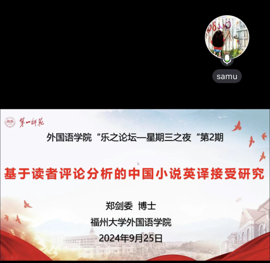 9月26日晚,应公司乐之论坛邀请,福州大学郑剑委博士为师生做了题为“基于读者评论分析的中国小说英译接受研究”的讲座。本次讲座是公司“乐之论坛:星期三之夜”系列学术活动的第二期,聚焦中国文学海外传播与接受研究的新方法。讲座采用线上的方式,吸引了50余位师生参与,由副经理王佳娣主持。