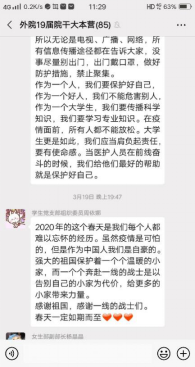危机时刻正是教育的宝贵时机,伟德国际1946bv官网、体育公司党总支通过线上线下方式结合,引导青年学子听党话跟党走,在为人民服务中茁壮成长、在艰苦奋斗中砥砺意志品质、在实践中增长工作本领,彰显了党组织的战斗堡垒作用和党员的先锋模范作用。