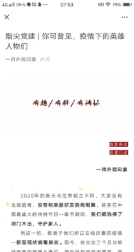 疫情防控期间,主题党日活动如何开展?伟德国际1946bv官网员工党支部创新活动方式,搭建云端学习平台,广泛开展在线互动交流,先后举行了“听习语金句,记青春使命” “致敬逆行者,争做排头兵”“线上应援”等线上主题党日活动;“一师外院印象”微信公众号开辟了“指尖党建”专栏,及时推送发布学习资料、先进事迹,使党员深刻领会“危难面前显忠诚,挑战面前显担当”的精神。体育公司员工党支部开展“新春走基层,镜头见初心”主题党日活动,员工党员走进当地社区,用心记录基层党员在抗疫一线的责任担当。