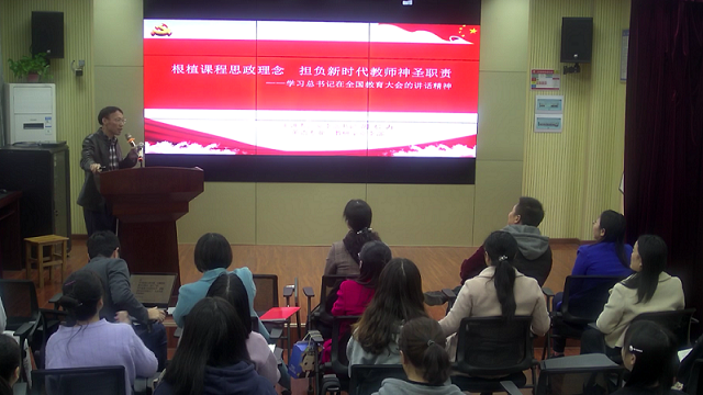 胡书记的党课围绕“学习习近平总书记全国教育大会讲话精神”、“新时代教师的神圣使命与担当”、“课堂根植思政理念”三个主题展开。胡书记首先宣讲了习近平总书记在全国教育大会的讲话精神、指导思想和主要任务。接着,他以自身30多年教龄的亲身经历说明教师是立教之本、兴教之源,建设高素质专业化教师队伍,就要把习近平总书记的要求落到实处。最后,他向党员们分享了英语专业课程如何落实思政理念的探索。
