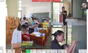 (图为bevictor1946韦德官网“红色·丝路”教育服务关爱团的成员正在为新疆、贵州的同学们上英语童瑶课)