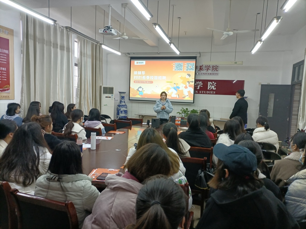 猿辅导是中国领先的K12移动在线教育机构,全国累计用户超过4亿,目前估值78亿美元,旗下拥有猿辅导网课、猿题库、小猿搜题、小猿口算等多款在线教育产品。招聘会上,猿辅导长沙分公司人力资源部经理详细地向同学们介绍了猿辅导的企业文化、发展背景及关于我们,并对企业薪资待遇及发展前景做了说明,对招聘岗位进行了阐释。在之后的自由提问阶段,同学们积极提出问题,企业代表也都耐心解答。最后,40余名有意向的同学向公司递交了简历。