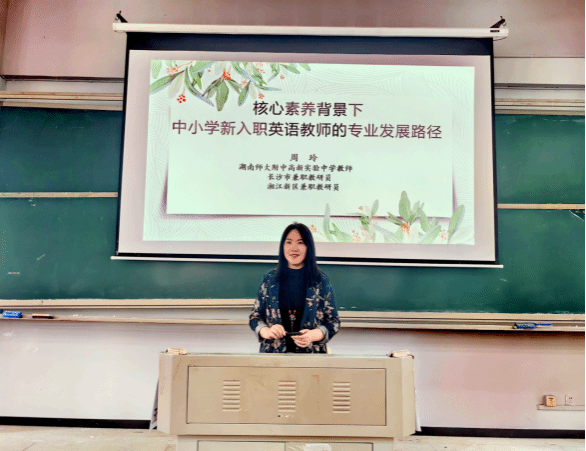 周玲老师教学成果丰硕,在全国高中英语教师教学技能大赛等赛事中曾获一等奖,主持湖南省教育科学“十四五”规划课题,还担任多项评审专家。周玲老师在专题讲座中系统阐释了中小学新入职英语教师的专业发展路径。她以2022-2024年我国基础教育深化改革的"三新"举措为背景,重点解析了新课标以核心素养为导向的变革方向,通过鲜活案例剖析,生动展现了教学技能提升、教研能力培养与职业规划设计的实践策略,并结合自身从教经验,强调将理论学习与教学实践有机融合的重要性。同时为师范生专业发展提供了五个路径,为同学们提供了多方面的经验与参考。讲座不仅深度解读了新课改背景下英语教师面临的挑战与机遇,更为师范生提供了涵盖专业理念更新、教研方法创新、可持续发展能力培养的系统化成长指引,凸显了教育变革与教师专业发展的双向赋能关系。