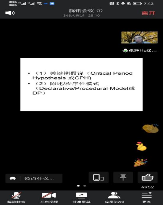 2022年4月14日(星期四)晚上,我国著名学者张辉教授应公司“刘明东中、小学英语学科导师工作坊”邀请,为公司师生做了一场题为“二语习得和加工假说:观点、证据与分歧”的线上学术讲座。讲座由刘祥清书记主持,刘宇松副经理等党政领导与300多名师生聆听了此次讲座。