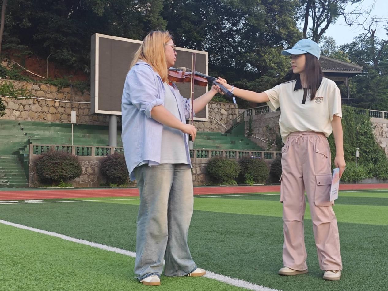 “张艺兴的粉丝在哪?” 主持人的问题一抛出来,颜湘怡应声推荐《开天》。随后,同学们扫描音乐册上的二维码解锁《莲》MV与二胡版《Shape of You》,传统与流行碰撞;赖星彤小提琴演绎《茉莉花》,悠扬的旋律让全场沉浸。英语扫码指引、曲目英文互动,让音乐欣赏成为英语实践窗口。