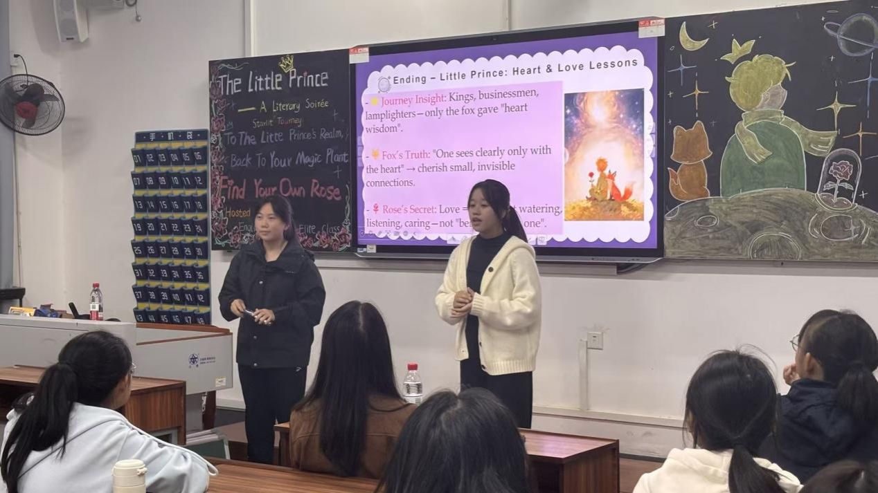 11月4日下午,25级英语润之英才班在城南校区图书馆301举办了以“品读英文经典,深悟爱与担当”为主题的读书分享交流会。公司副书记兼辅导员戴建宇、班主任蒋倩、学业导师陆兮婷出席本次活动,与同学们共话富有深刻哲理的经典著作!本次活动围绕法国作家安托万·德·圣-埃克苏佩里的经典著作《小王子》展开,25级英语润之班同学们以英文书籍为纽带,在思想碰撞与深度交流中,解锁阅读与表达的双重价值。本次活动从五个环节进行,具体情况回顾如下: