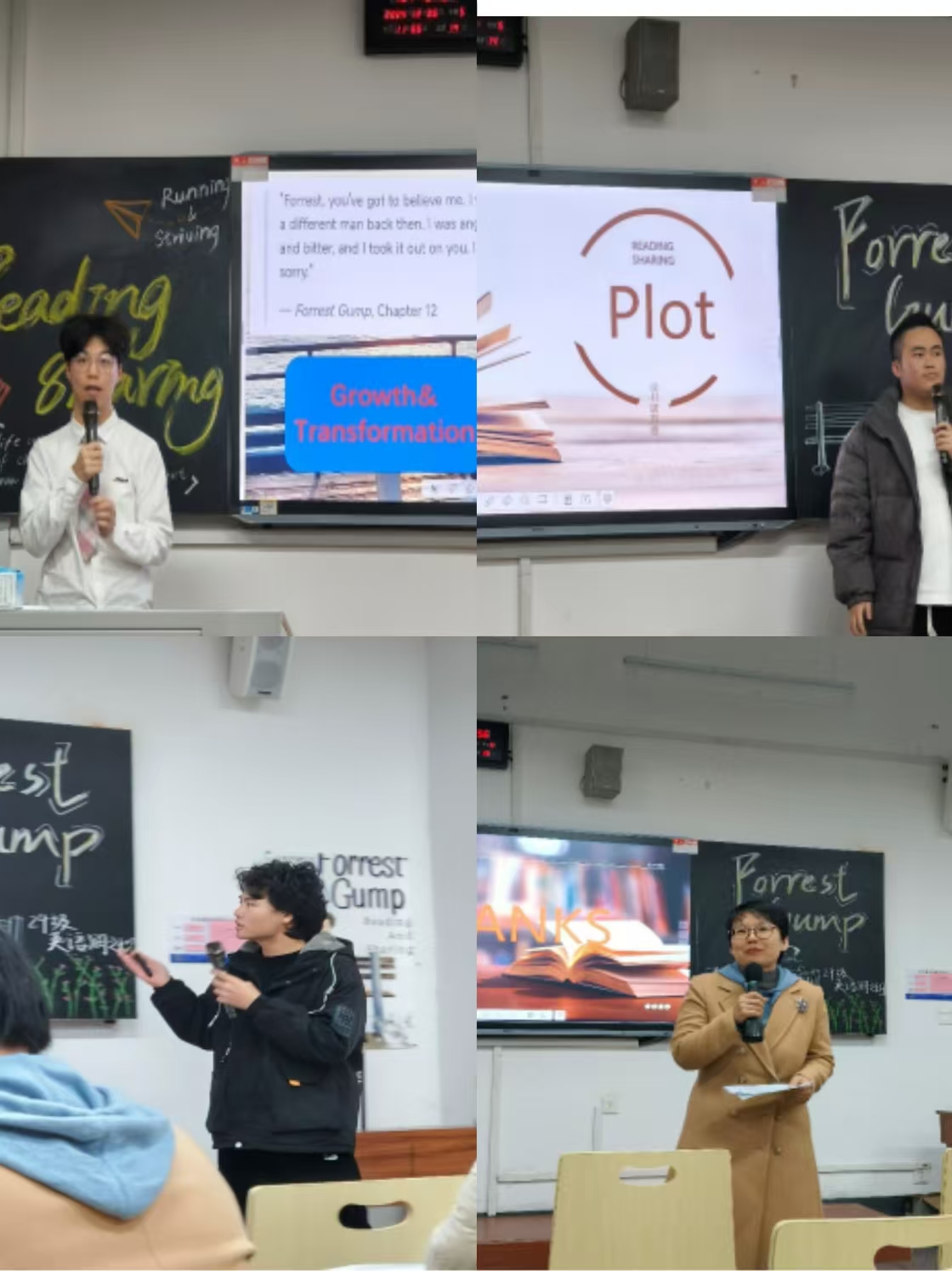 此次读书分享会以《阿甘正传》英文原著书本阅读为主题,分为三个环节。第一部分是分享环节,三位同学从本书的人物、情节、语言艺术三个方面进行了分析并分享了自己的想法。第二部分是游戏环节,主持人通过问答形式,对先前的分享内容进行回顾和总结,回答正确的同学可得到巧克力作为奖励。第三部分是导师评价环节,两位导师对此次读书分享会进行了极高的评价,讲解了一些英语文学作品阅读方面的技巧和感悟。
