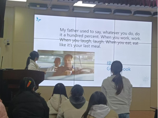 活动尾声的“朗读电影台词,感悟人生哲理”将气氛推向高潮。经典台词如《绿皮书》中“Whatever you do, do it a hundred percent. When you work, work. When you laugh, laugh. When you eat, eat like it is your last meal.”等被一一解读。参与者不仅通过模仿电影原声学习到了地道表达,更是从台词中学习到了不同的人生态度。