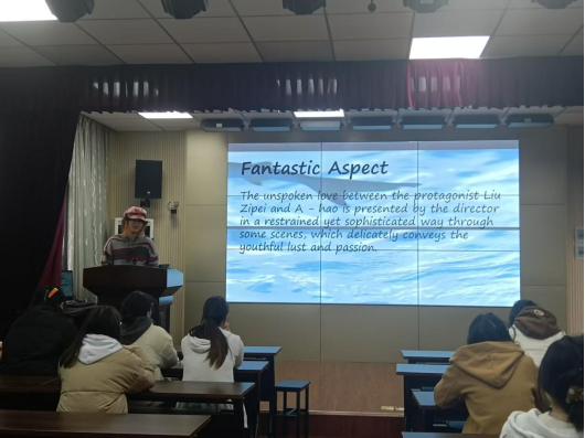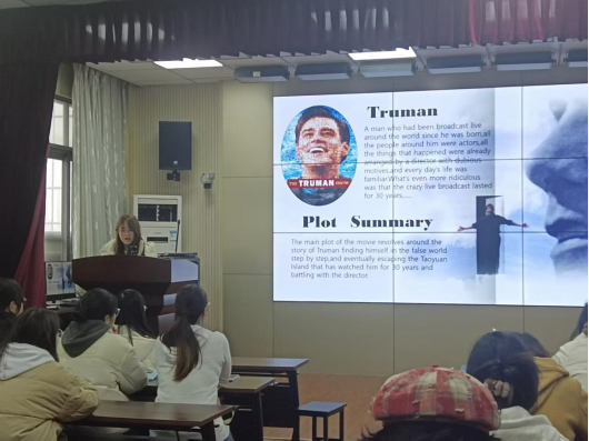 最后向倩倩同学分享了《楚门的世界》。她以“No way, mister. You’re going to the top of this mountain”的台词开场,剖析了楚门在虚假乌托邦中的觉醒与反抗。她提出思考:“如果生活被全程操控,你会选择安逸还是勇敢逃离?”引发同学们的思考。