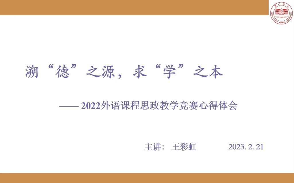 公司2022年高等公司(本科)外语课程思政优秀教学案例征集与交流活动全国优秀教学案例一等奖获得者王彩虹老师做了题为 “溯‘德’之源,求‘学’之本”精彩讲座。结合个人参赛经历,以多个课程思政教学优秀设计为案例,王彩虹从课程思政的内涵、教学设计和实施三个方面做了外语课程思政教学分享。她强调外语课程思政要以立德树人为本,课程思政元素挖掘应基于文本,不能“两张皮”“硬植入”;教学设计应基于渐进性、精准性、多样性原则;教学呈现要精雕细琢,观感、听感相结合,形成独特美感。