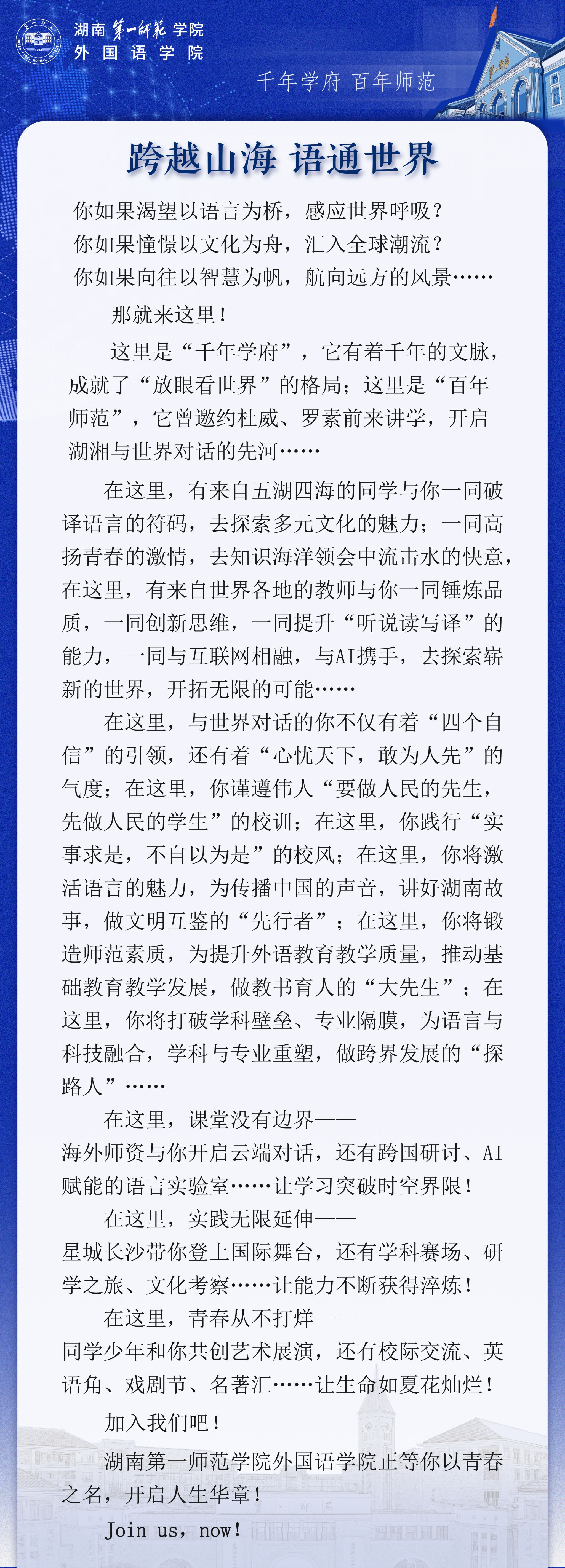 学长学姐带你看一师外院 来源:伟德国际1946bv官网林艳 日期:2025年06月24日 10:35 浏览数: “声影一师 语通世界”短视频大赛优秀作品展《百年师范韵,万语青春潮》《尺素传百年,文脉通世界》《你的大学答案书》《我们正青春》《译路研途》(责任编辑:陈迎;审核:王佳娣)