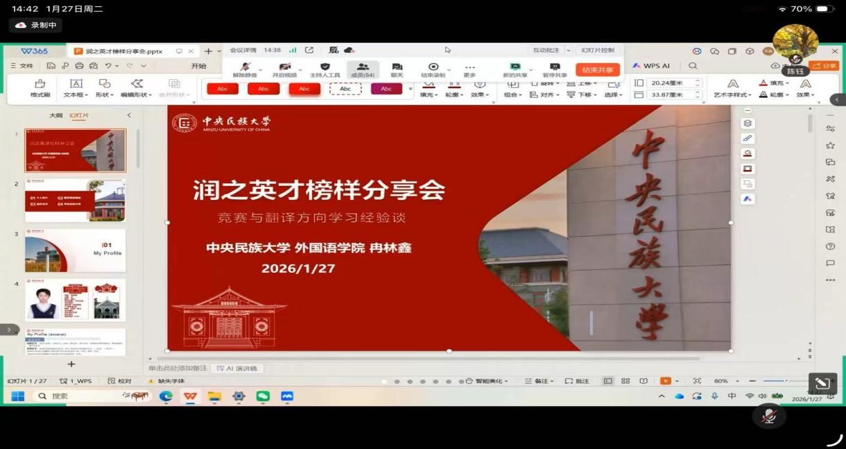 为精准提升员工翻译竞赛实战能力,引导员工合理规划寒假学习生活,2026年1月27日下午,公司通过腾讯会议成功举办翻译备赛经验分享会。本次分享会特邀全国翻译竞赛一等奖获得者冉林鑫学长担任主讲嘉宾,陈钰副经理出席并致辞,共吸引百余名员工线上参与,现场学习氛围浓厚。