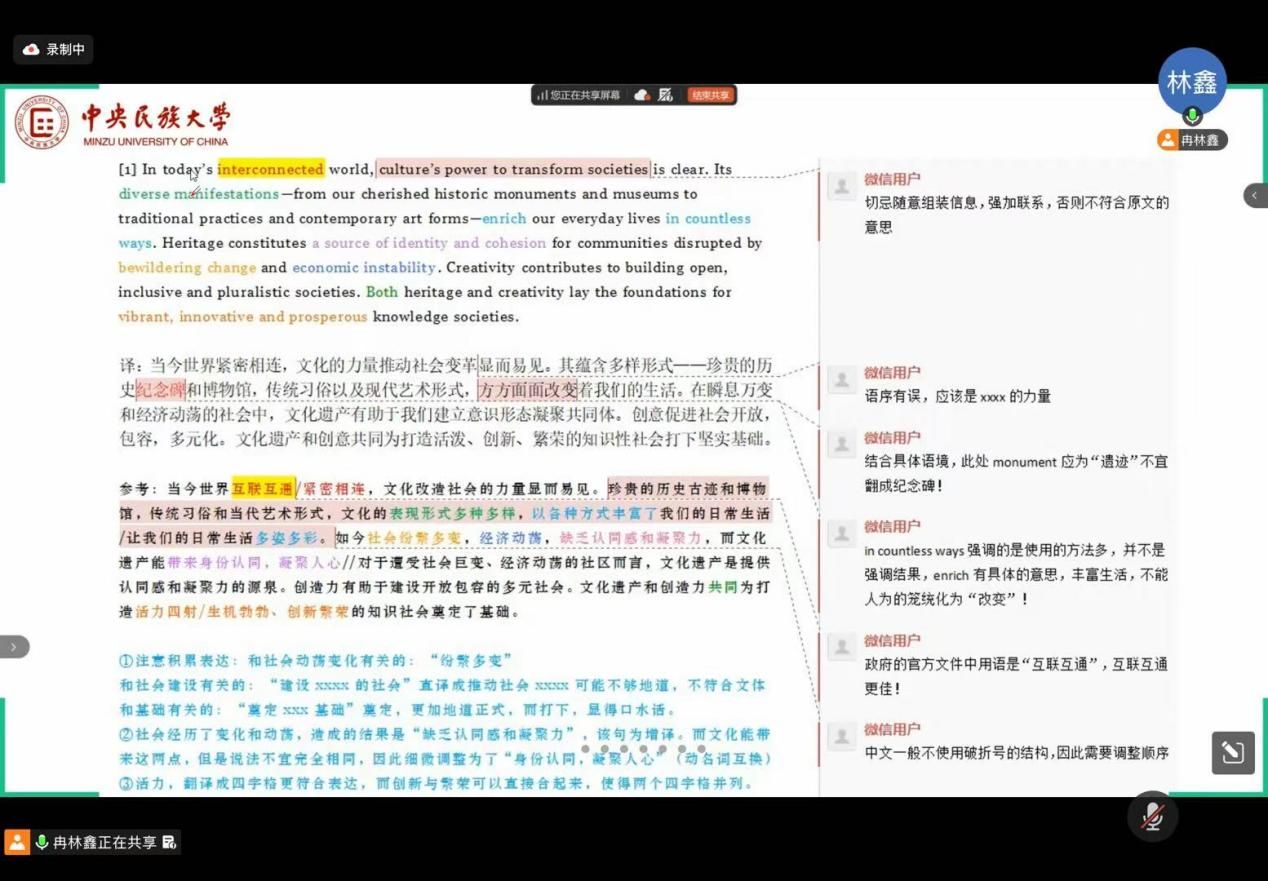 会议伊始,陈钰副经理发表开场致辞。她对线上参会的同学们致以热烈欢迎,着重强调翻译竞赛是检验专业知识储备、锤炼语言应用能力、拓展国际视野的重要平台,鼓励同学们以此次分享会为契机,主动汲取优质经验、潜心打磨专业技能。她指出,公司搭建此次交流平台,旨在为同学们理清备赛思路、凝聚学习合力,希望大家珍惜难得的学习机会,在互动交流中有所收获、有所成长,未来能在各类翻译赛事中脱颖而出,充分展现一师学子的专业风采。