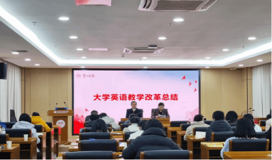 副经理陈钰对大学英语教学改革做了全面总结,从四级通过率、竞赛成绩、员工良性学习生态形成以及教师团队凝聚力四个方面肯定了阶段性可喜成效,表示要砥砺前行再出发,明确下一步改革发展重点构想。