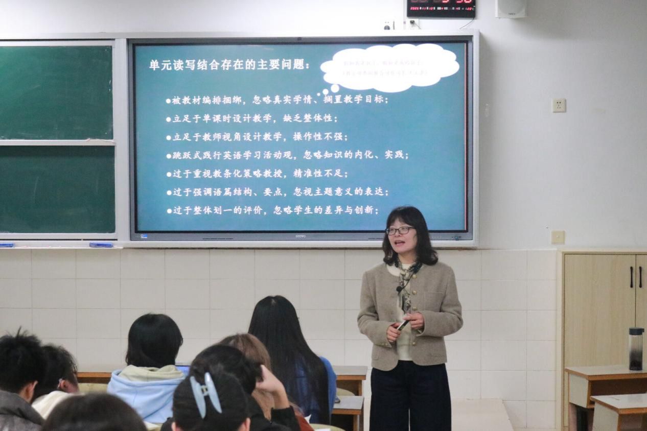 讲座尾声,于洪玲重点围绕“以读促写,读写结合”的主题,诠释了“教育是利他亦利我的创造性劳动”的理念,针对当前单元读写教学中存在的问题,结合具体案例提出改进策略。她特别以湖南师大附中博才学士中学袁墨凝老师的《Unit 2 We're Family!》Section B 2a-2b课例为示范,展示了如何立足单元视角进行教学设计,强调课堂要营造思辨氛围、呵护员工心灵,课件须简洁精要,引导员工扎根文本、高效学习。在互动环节,同学们踊跃提问,于洪玲逐一给予细致解答,现场气氛热烈。