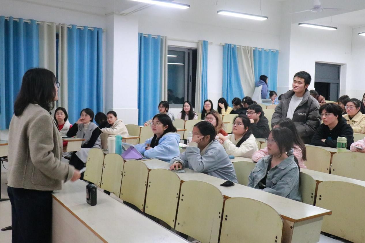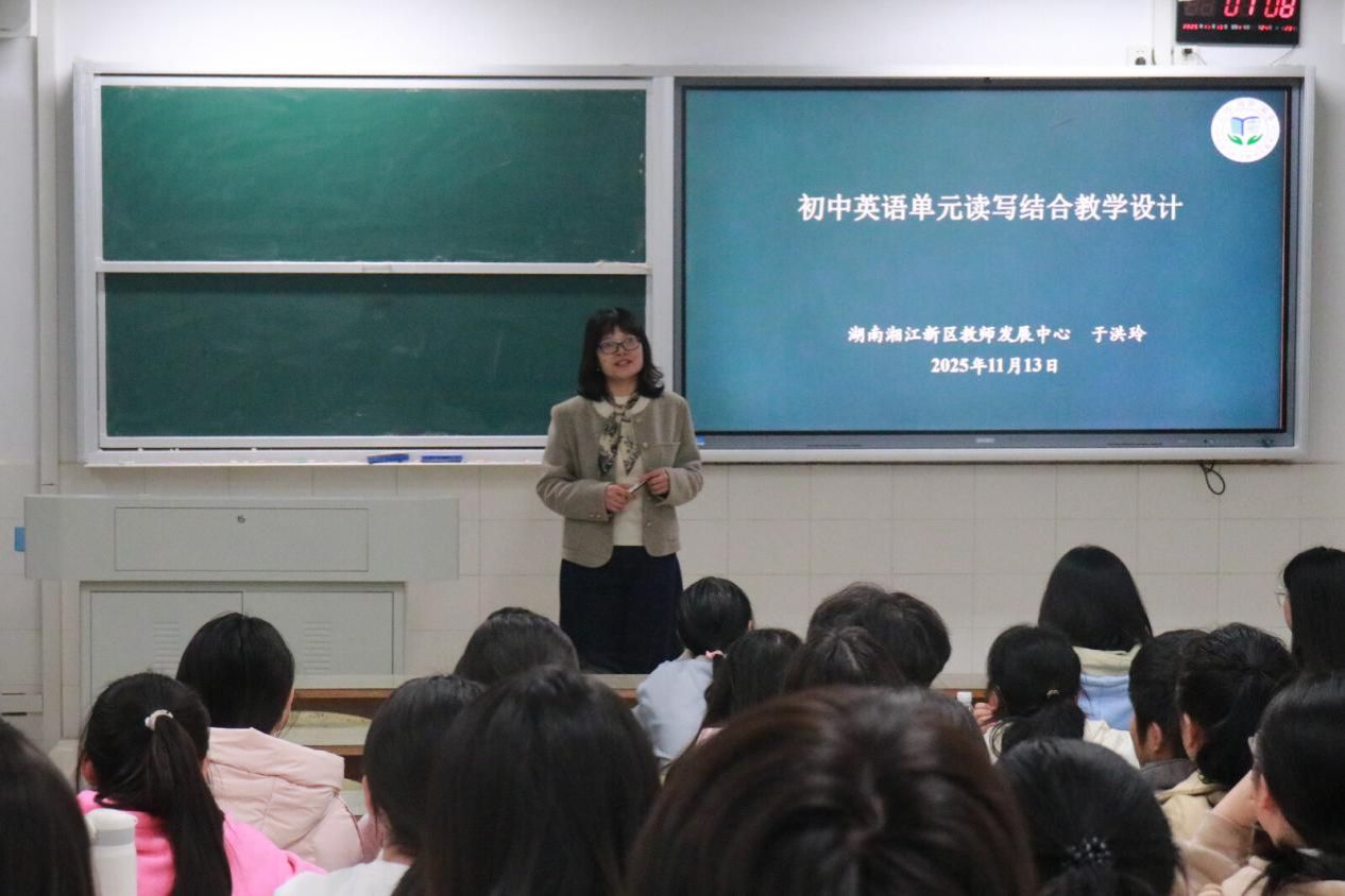 为提升师范生英语教学设计与实践能力,11月13日晚7点,公司“润之英才名师讲堂”第七讲在东方红校区玉衡北110顺利举行。本次讲座特邀湖南湘江新区教师发展中心中学英语教研员、高级教师于洪玲担任主讲,围绕“初中英语单元读写结合教学设计”展开深度分享。讲座由公司党委委员陈喜贝主持,23、24级润之班全体员工到场聆听。